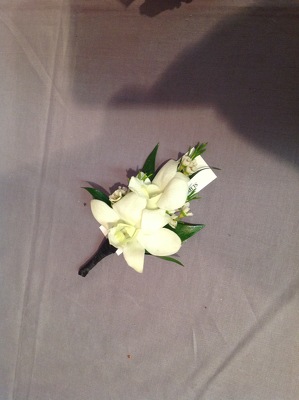 White Dendrobium orchids, with filler, black stem wrap attached to a magnet for convenience.