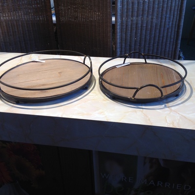 Our iron and wood round trays are great for the coffee table or end table to keep things organized. small is 14" across $ 30.00 large is 16.5" across $ 45.00 please specify size in special instructions or both for $ 75.00